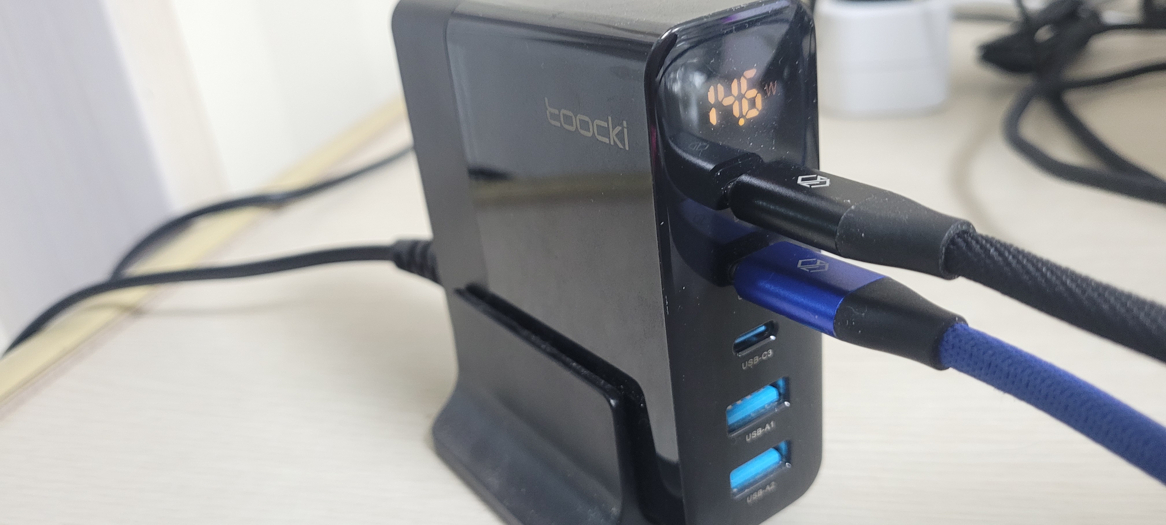 Toocki GaN 140W 충전기는 상단에 C타입 포트 3개, 하단에 A타입 포트 2개로 포트가 구성되어 있다. 제품에 동봉되는 U자형 받침대로 제품을 세울 수 있으며, 제품 상단에 LED가 있어 모든 포트의 출력을 합산한 값을 알 수 있다. 제품의 뒷쪽에는 AC 전원을 연결 할 수 있는 포트가 있으며, 기본 제공되는 전선을 연결해 사용할 수 있다.