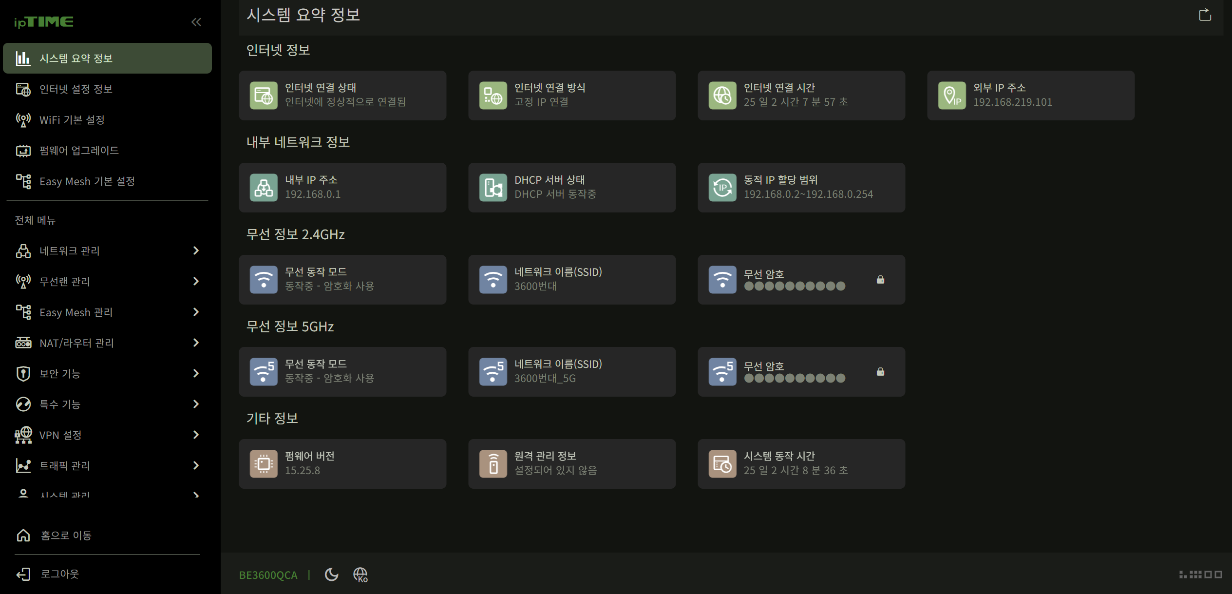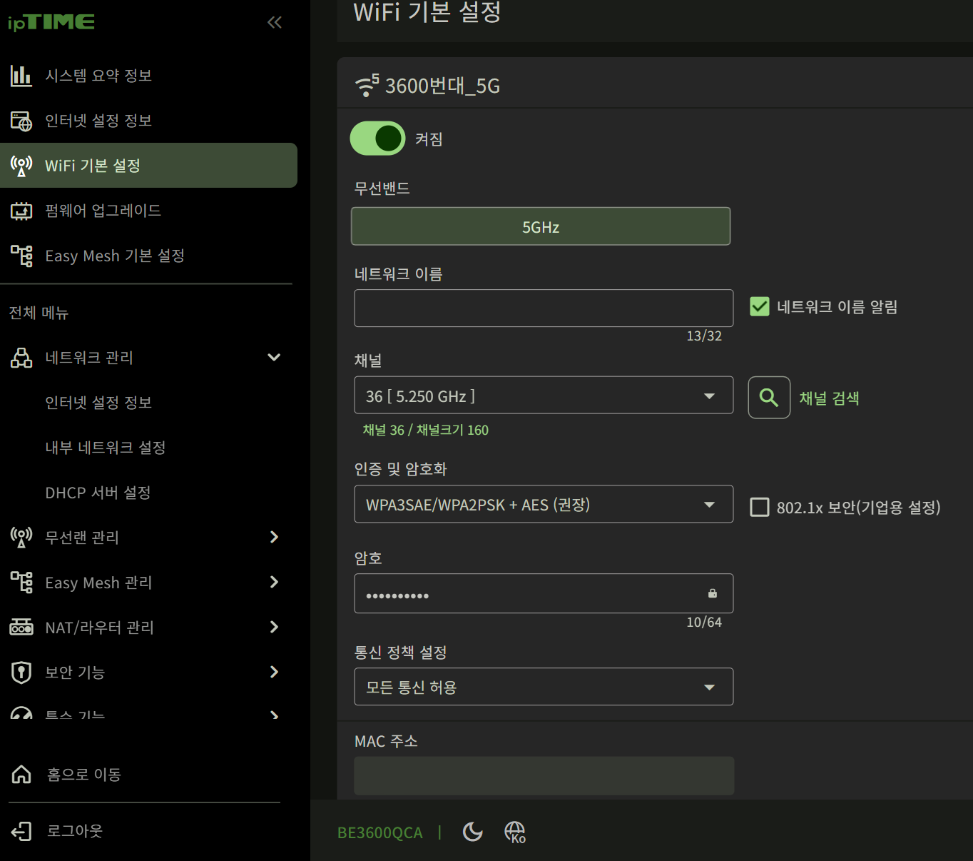 iptime 설치 도우미 앱을 사용하거나 http://192.168.0.1/의 설정 페이지에 로그인 하면, 와이파이 기본 설정 페이지에서 와이파이 이름과 암호, 보안 방식 등을 바꿀 수 있습니다. 이곳에서 포트포워딩을 하거나, 현재 사용중인 기기를 볼수도 있었습니다. 제 경우에는 기존 사용하던 공유기에서 포트포워딩 설정을 해둔것이 있어, 그 설정을 입력하느라 다소 시간이 걸렸습니다.